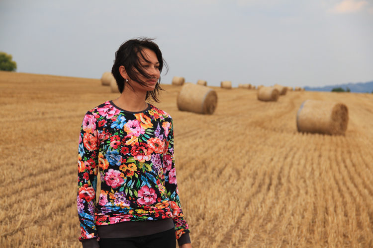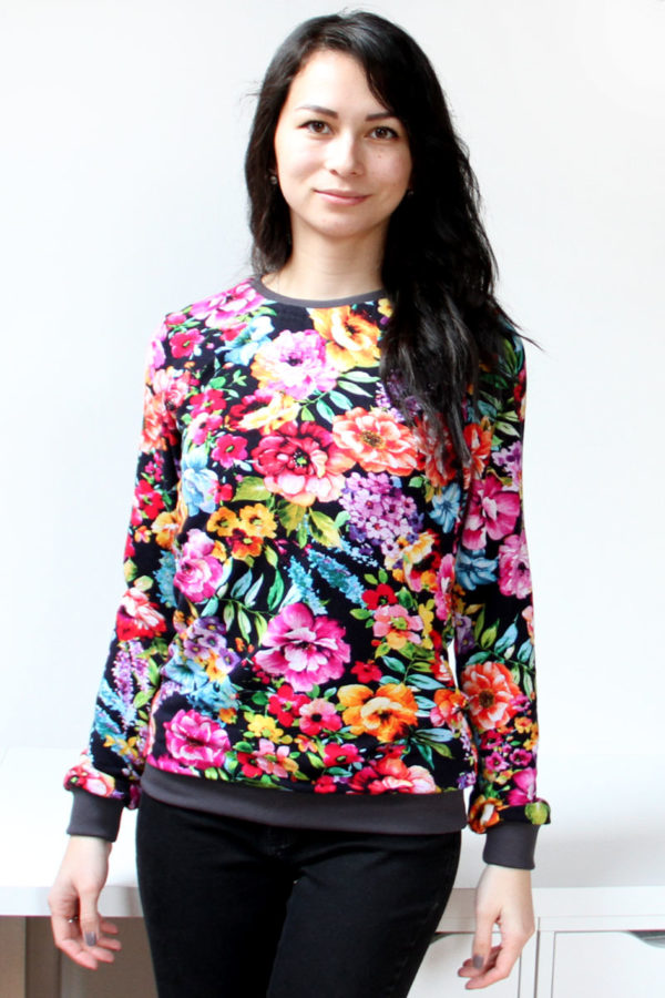 The most suitable material is a French terry knit (either cotton + elastane or cotton + lycra). Thanks to the lycra, the sweatshirt will be more elegant and flowing - the sweatshirt with a floral print is made from this material.
