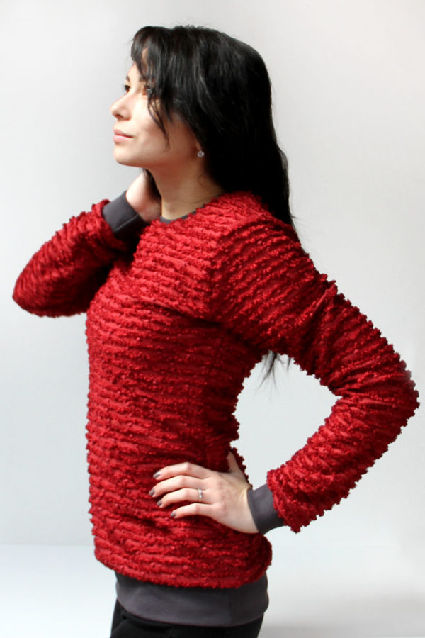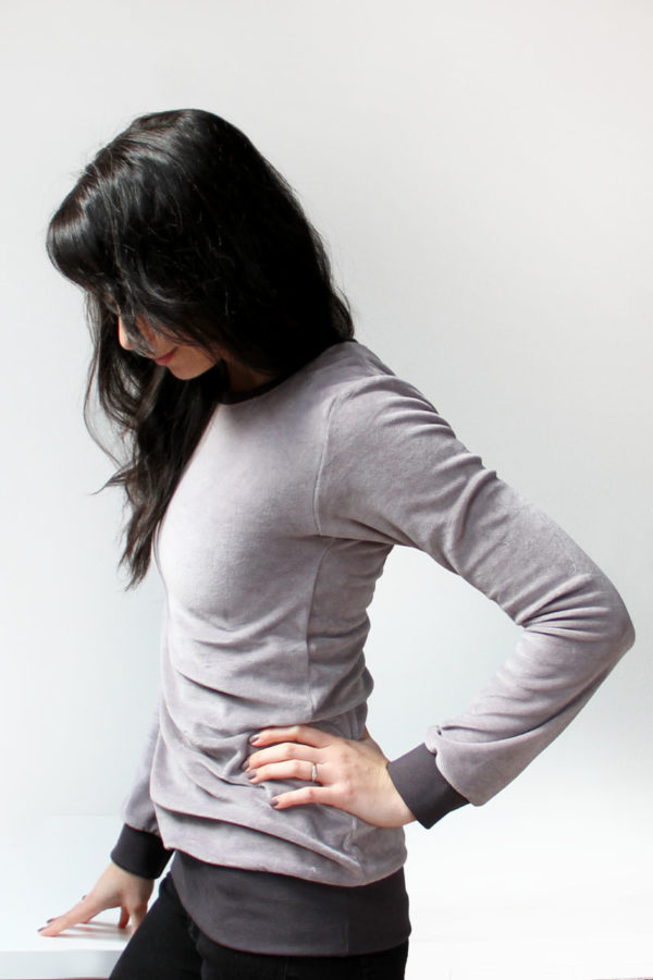 Another excellent material soft velour (gray sweatshirt). But be careful when shopping for this type of fabric, some of these plushes are elastic and some are not (rigid fabrics aren’t suitable for this sweatshirt).