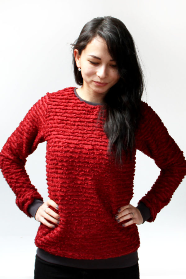 This sweatshirt is designed to be semi-close fitting. The sleeves (and bottom edge) are finished with hem knits. The pattern for women’s sweatshirt is constructed in a professional program for clothing pattern development and it is available in sizes 32–56.
