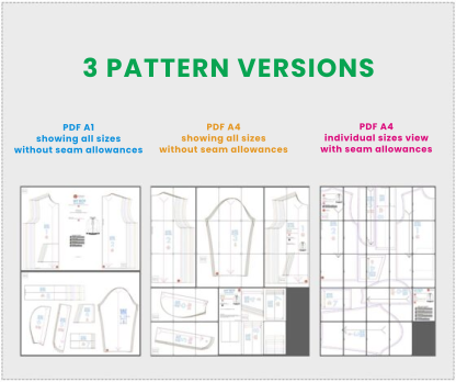 - 3rd version (classic view) – PDF A1 pattern showing all sizes without seam allowances. This large-format pattern does not need to be glued together. You can print it on a home or office plotter or in one of the many copy centers.