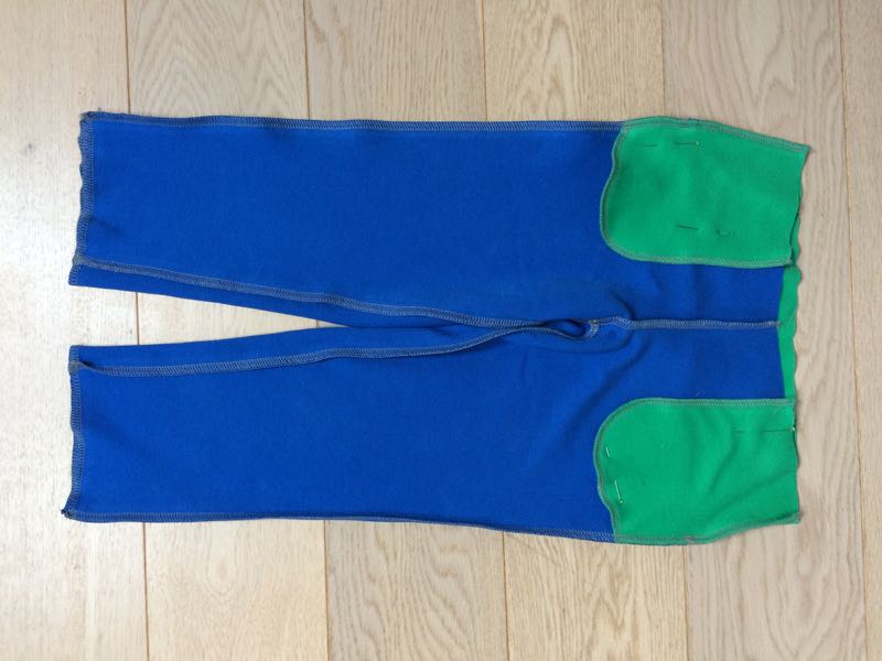 Now place the front pieces face side down. Lay the whole pocket pieces over the pocket pieces with openings (face side to face side), pin, and sew both pocket pouches. Don’t sew through the front pieces of the sweatpants.
