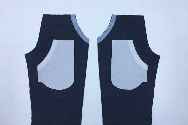 Let’s work on the pockets first. Lay the pocket piece over the front piece (face side to face side), pin, and sew the pocket opening.