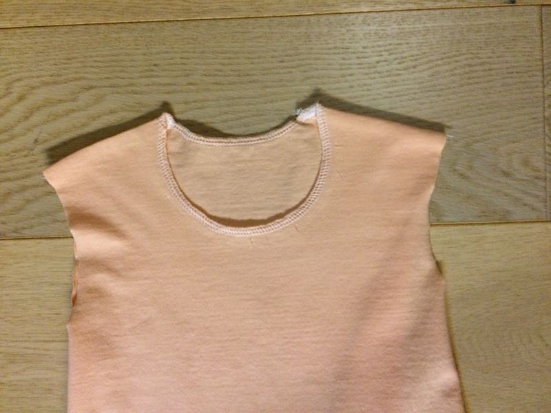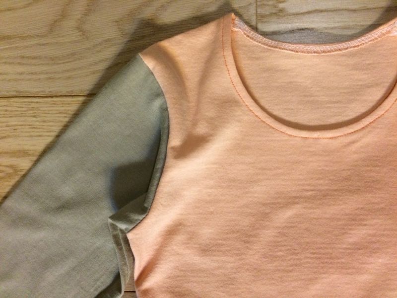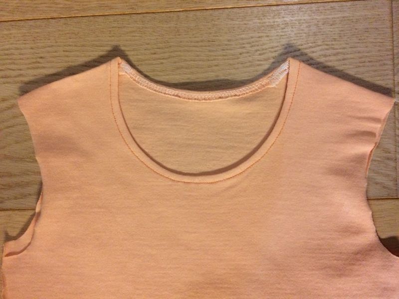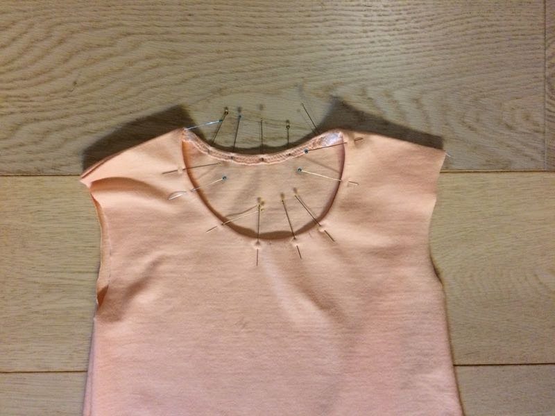 Topstitch the neckline - use an elastic stitch (three-step straight stitch, narrow zig-zag stitch, etc.) and sew around the entire circumference of the neck opening. Pin the sleeve pieces to open armscyes (face side to face side).