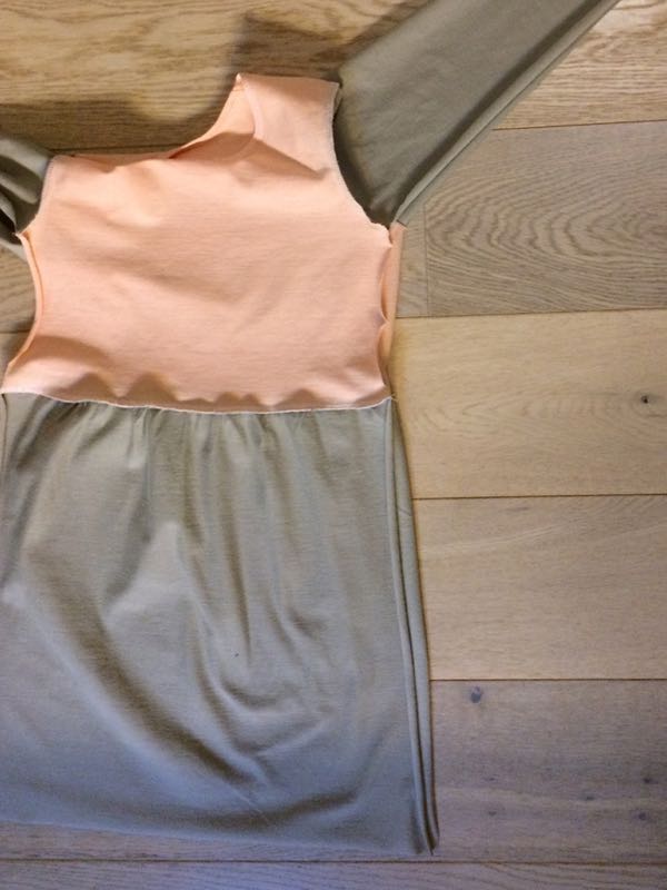 Turn the dress inside out and sew the sleeve and side seam in one go. Repeat on the other side.