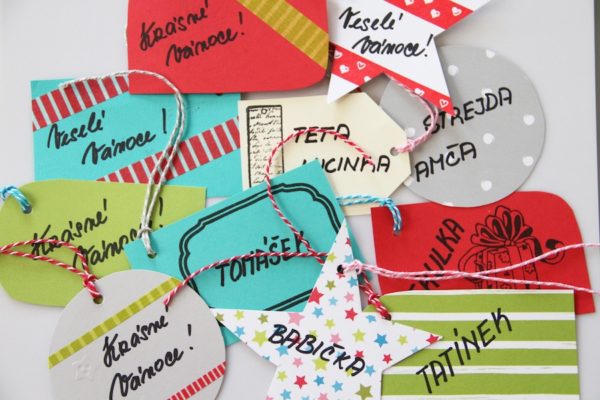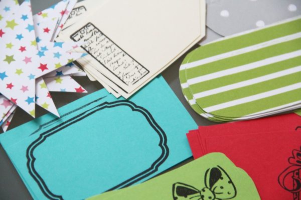 Do you have leftover pieces of colored paper that you would like to use somehow? Try making simple paper gift tags. You can also use decorative stamps or an embossing set (if you have one).