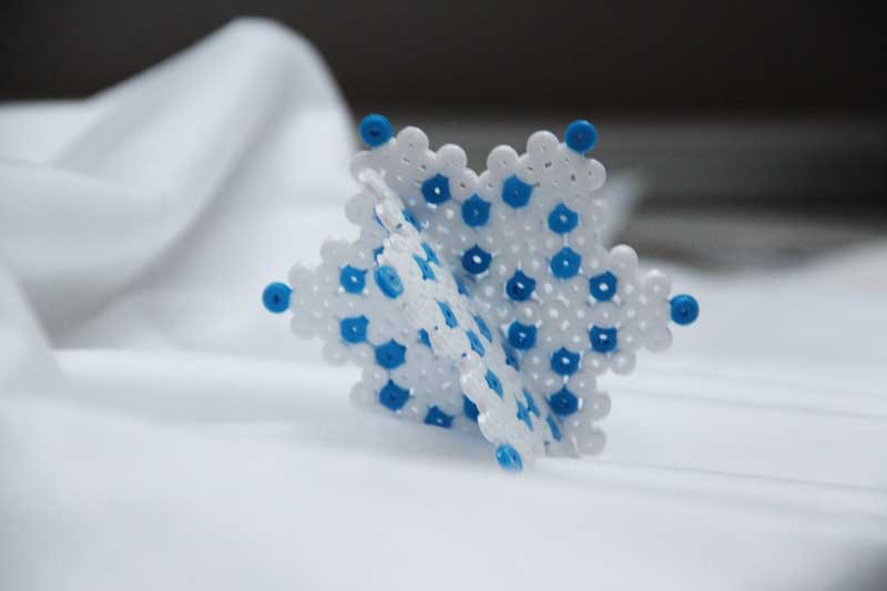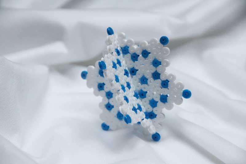 Create a symmetrical star in any color. Remove the middle bead and all beads to one side of it and melt the beads. Make another star/snowflake in the same way. Then all you have to do is snap the flakes together (use a little super glue if needed).